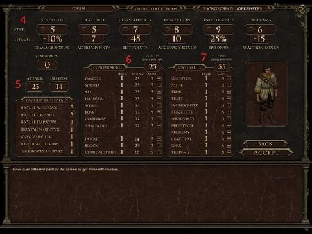 5. Your attack and defense numbers, balanced out by your main combat skills, and a general idea of how effective you will be in a combat situation.