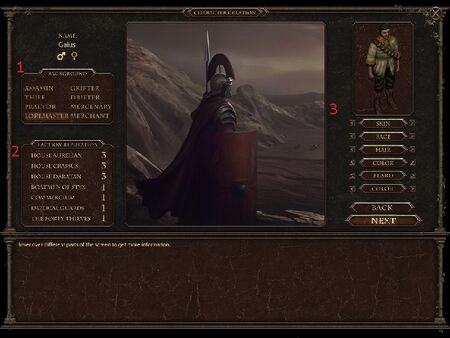 1. Name, Gender, and Background. This determines what everyone will call you, what gender specific clothing you can equip(there is a little bit), and what starting quest, reputation, and inventory you get.