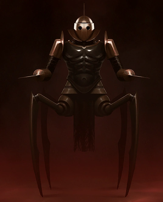 At first glance it appears to be a kind of hideous shrine or statue, a metal spider rearing up on its back legs. But taking a few steps forward you see it's a machine, a mechanical construct straight out of some sorcerer's nightmare. The top half is humanoid, with arms ending in blades, and not the kind used for chopping vegetables. This upper part is perched on four spike-tipped legs, any one of them long enough to run a man through.